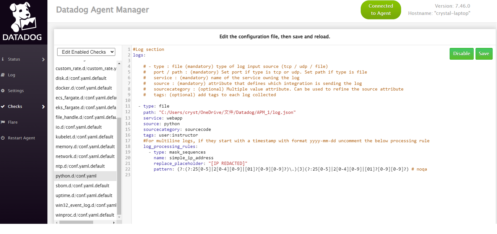 As an example, you may hide the IP address from the log entries by adding the following config to the DataDog agent with log collection enabled. We are using a python app and create a file conf.yaml in the conf.d/python.d/ directory with the following content: