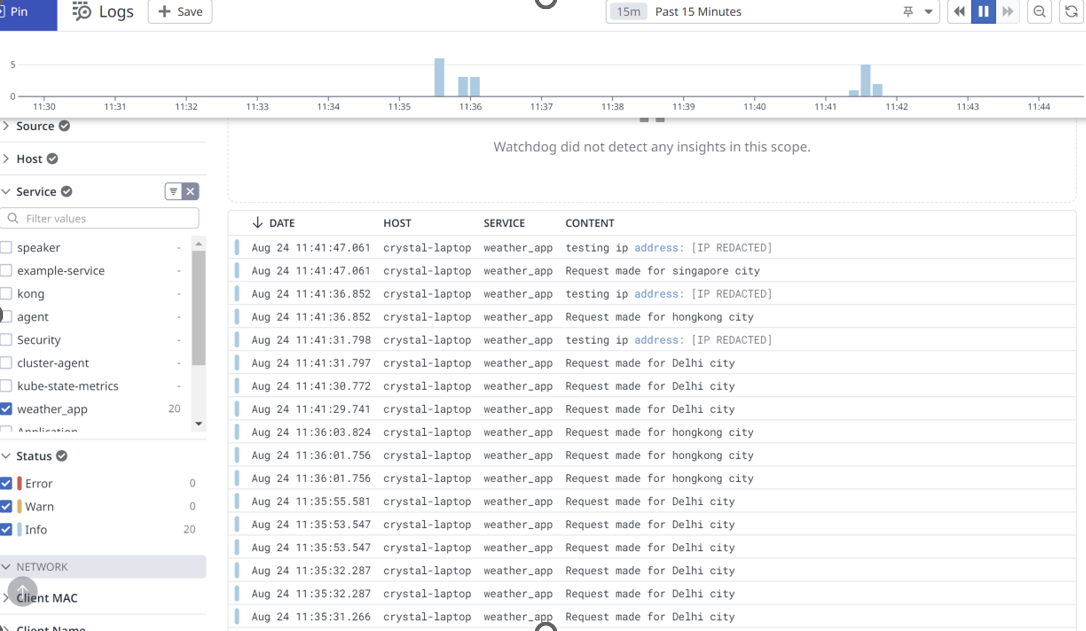 DataDog logs dashboard showing successful IP address masking with [IP REDACTED]