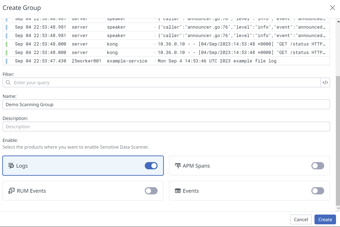 - Go to the Sensitive Data Scanner page and click on Add a scanning group